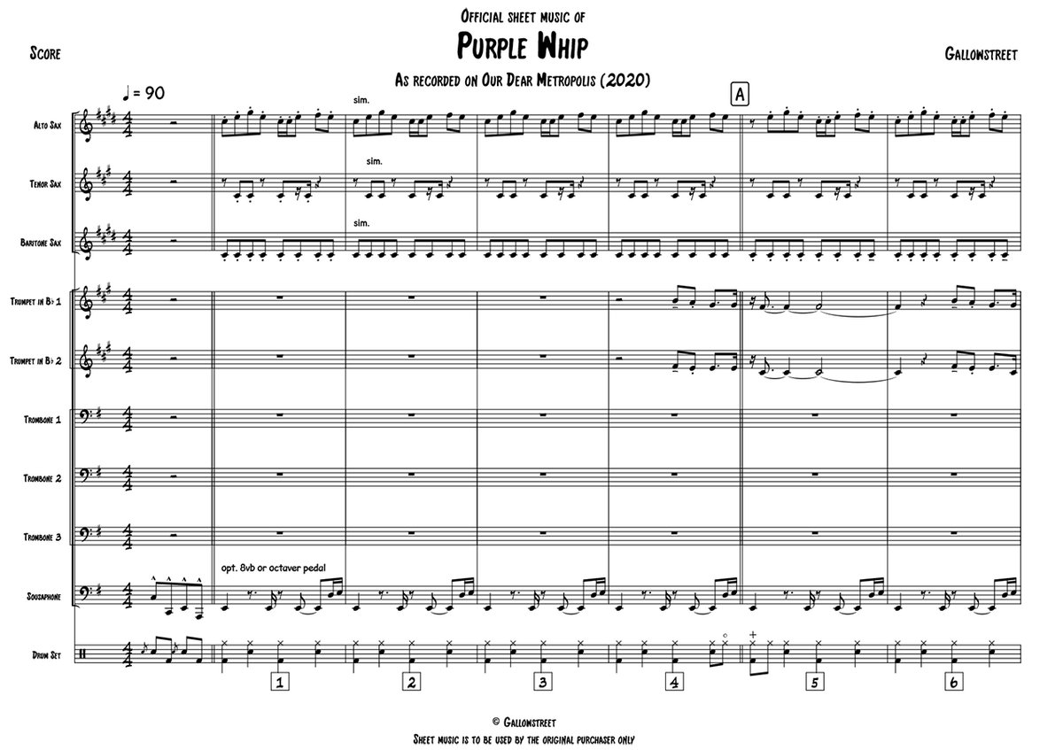 Official sheet music of Purple Whip, as recorded on Our Dear Metropolis (2020).